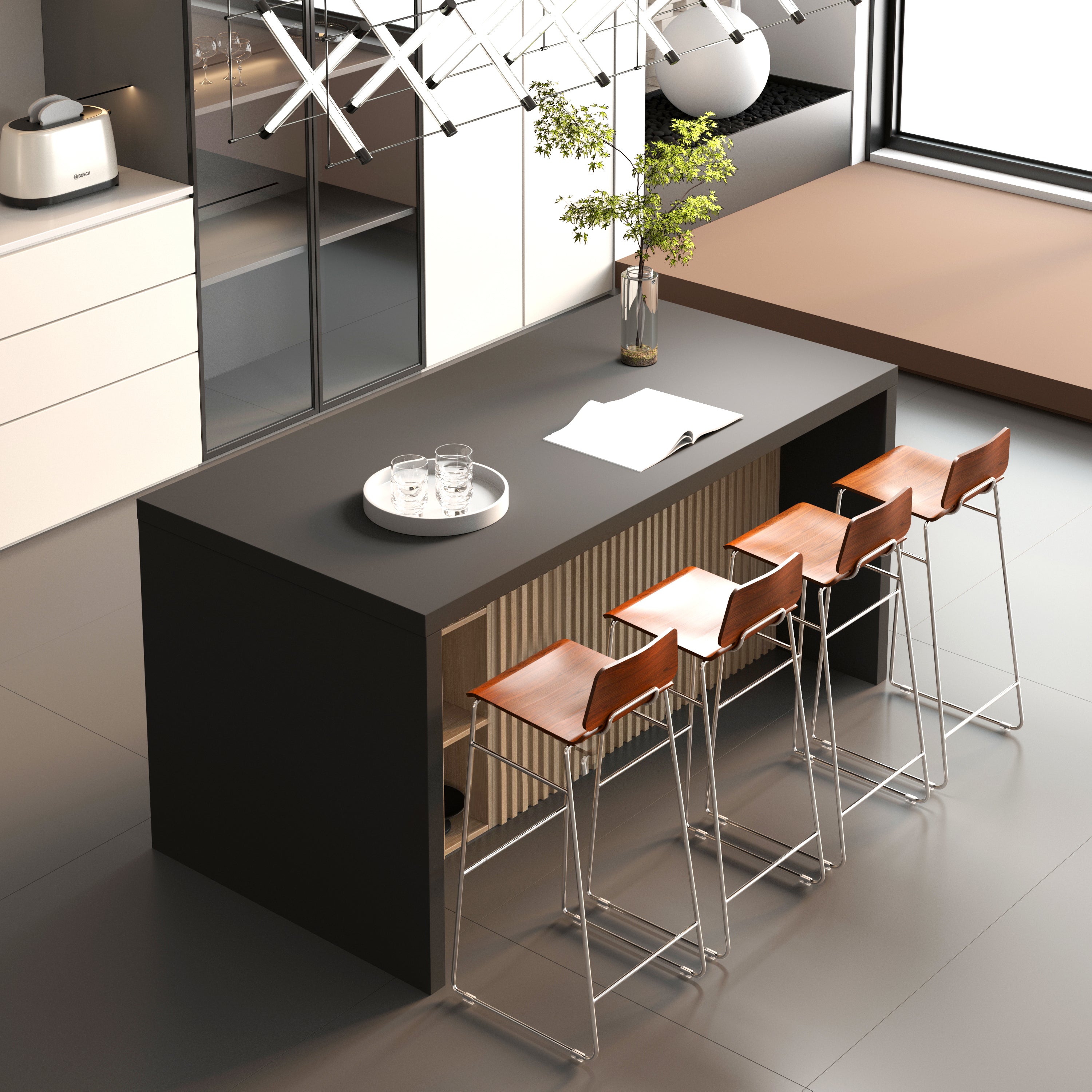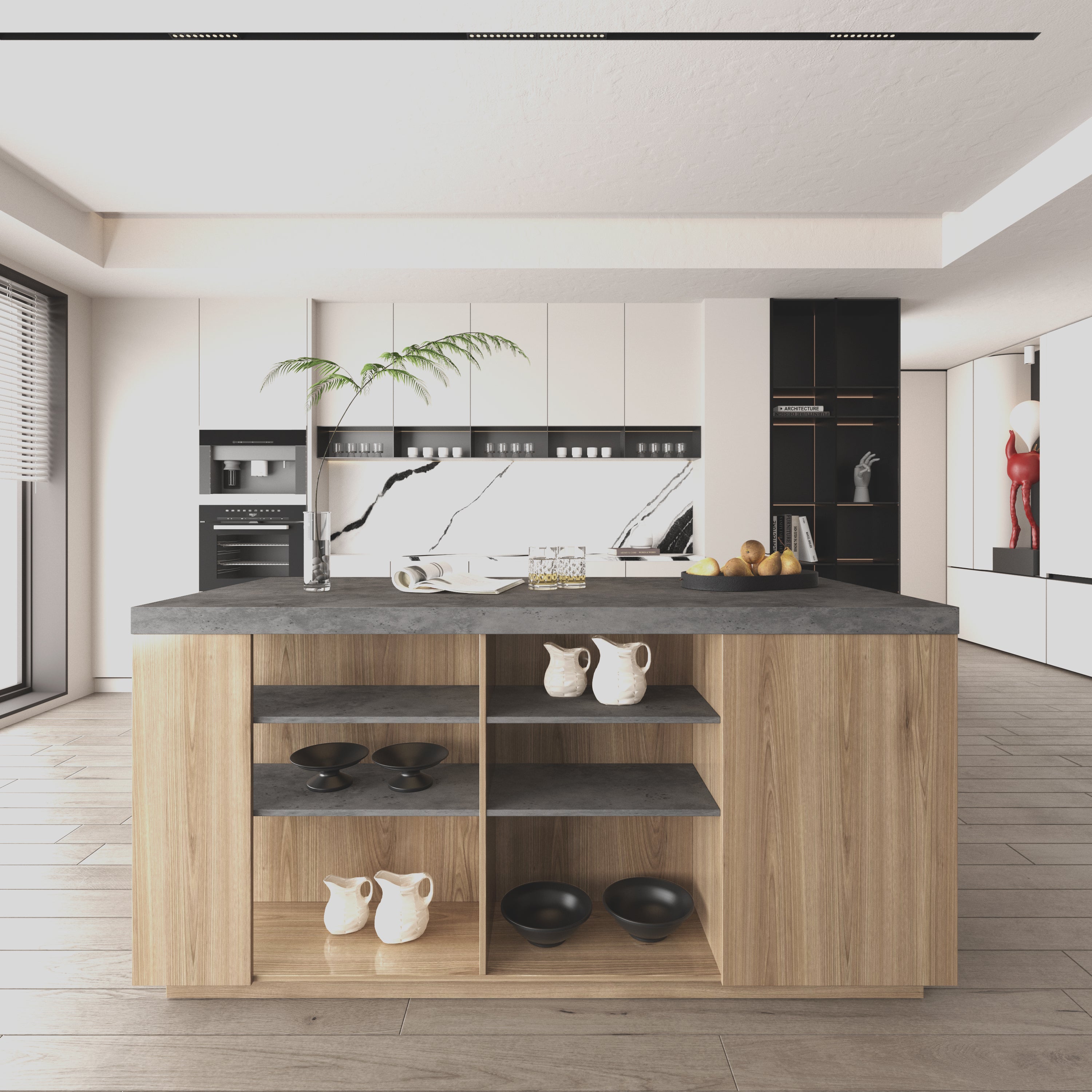Feature1:This multifunctional kitchen island serves as a breakfast bar, evening bar, and temporary workspace. The wet bar creates a cozy spot for family chats and adds a ritual touch to evening drinks.